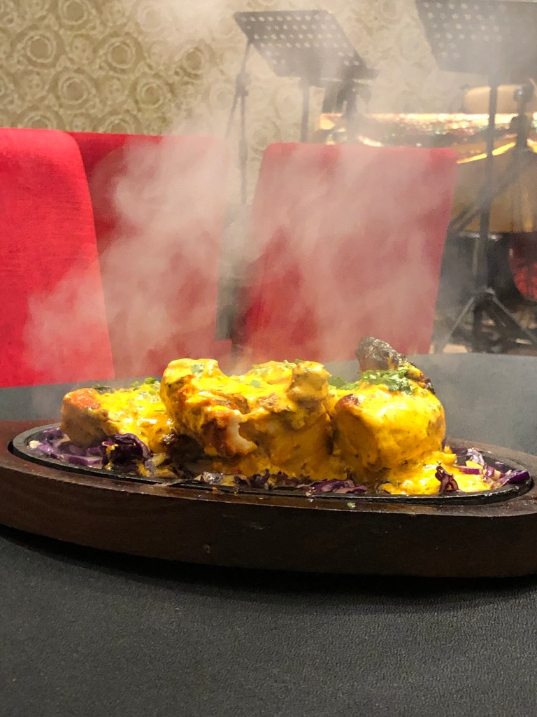 Pan seared chicken marinated in whole spices, best complemented with magaj naan.